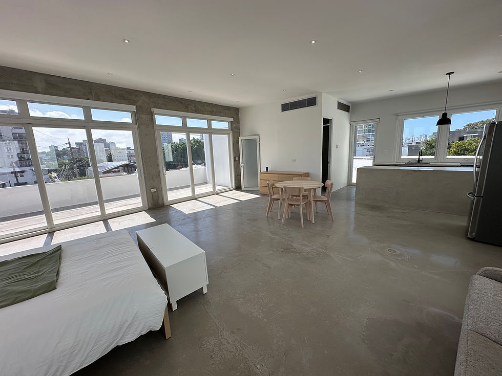 Perched on the top floor in the heart of vibrant Calle Loiza, this bright and modern studio offers an exceptional blend of style, comfort, and reliability. Flooded with natural light from multiple exposures, the space features an open-concept layout with floor-to-ceiling sliding glass doors and wraparound windows that create an airy, loft-like feel. The private balcony extends your living space outdoors perfect for enjoying morning coffee or evening breezes above the energy of the city. The minimalist concrete finishes, recessed lighting, and clean modern lines give the apartment a contemporary aesthetic, while the efficient layout comfortably accommodates living, dining, and sleeping areas. A rare and valuable feature: the building includes full backup power and full backup water, providing uninterrupted comfort and peace of mind year-round.